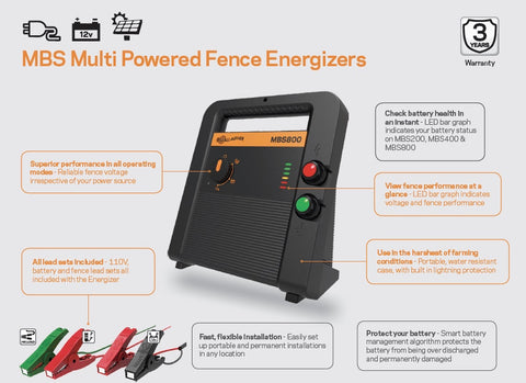 El nuevo Energizador Gallagher MBS 200 ofrece una solución superior y conveniente para el control de animales. Rendimiento superior en todos los modos de funcionamiento con voltaje de cerca confiable independientemente de su fuente de alimentación.