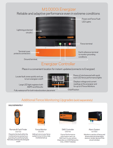Combining the brute force power of 100 stored joules with the fence monitoring smarts of the i Series accessories, the new M10000i will deliver more power to the back of the farm than any other energizer. Suitable for fencing all types of animals on up to 1000 acres. The M10000i provides incredible fence performance regardless of extreme temperature conditions or unreliable power supply - adjusting power output to suit your fence conditions and minimize power consumption.