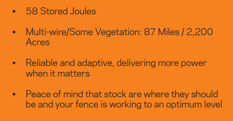 Maximum stock control. Combines 58 joules of power with adaptive technology which allows the unit to adjust to changing fence conditions.