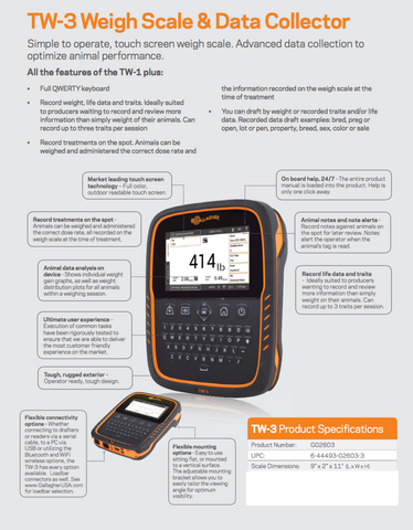 Compatible with all Gallagher load bar systems, the TW-3 ships complete with a protective carrying case, mounting hardware, microfiber cleaning cloth, charging cables for both battery and AC power, USB data transfer cable, and a USB drive preloaded with Animal Performance Software. Free shipping included throughout the United States.